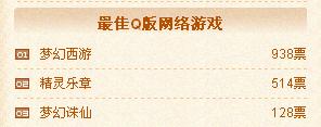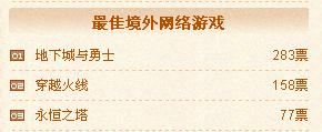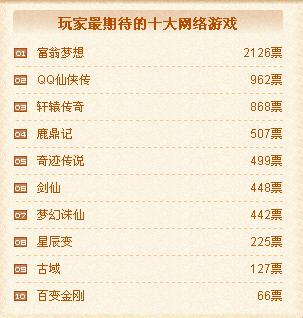 玩家最喜爱的十大网络游戏榜上,天龙八部以一万余张的高票数遥遥领先,紧随其后是精武世界,地下城与勇士,梦幻西游列三四位。争夺战已经打响,我们隐隐嗅到了硝烟的味道。最期待的网络游戏榜中,富翁梦想名列榜首。其他精彩的游戏纷纷紧随其后,给我们留下了很大的猜想空间,最期待无疑也是一个很有悬念的榜单啦。来势勇猛的天龙八部和精武世界在最佳原创榜单中也同样表现不俗,牢牢占据榜首。刀剑英雄II, 富翁梦想和传奇世界也不甘居后,票数也在迅猛增长中。最佳境外榜单中我们看到了老将地下城与勇士和新秀永恒之塔,穿越火线也很值得关注。最佳3D中永恒之塔暂列榜首。Q版中梦幻西游高票领先,精灵乐章和梦幻诛仙也蓄势待发。Webgame方面则是群雄逐鹿了,几家大型网页游戏商的作品牢牢占据榜首,竞争空前激烈。感受到了心跳的加速,感受到了空气中的紧张,持续关注吧!又一场战役将永存于历史的时空!
