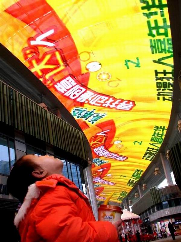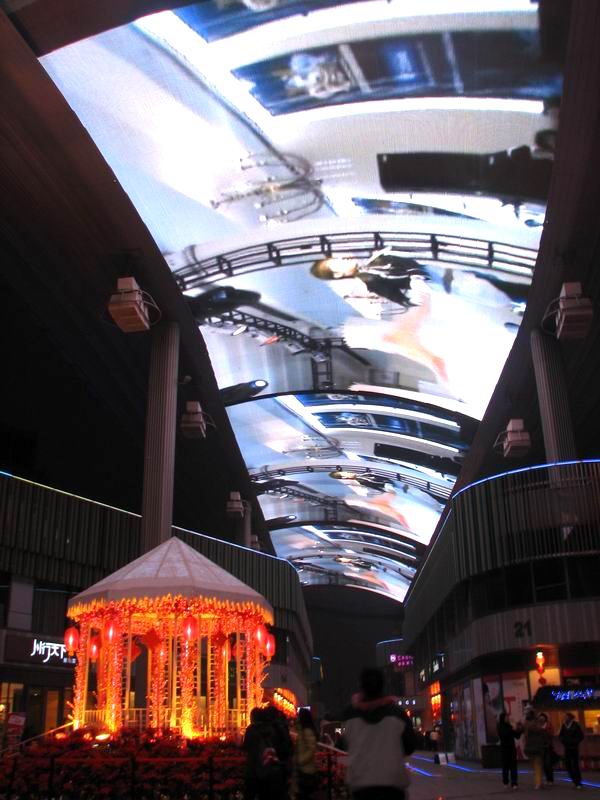 当然最令人震撼的还是在傍晚时分,国内最大的LED天幕开始滚动播放最新的动漫影视作品及本次活动精彩回顾。下午14时,舞台区上空的天幕率先试播就引起轰动,随着夜幕降临,西广场的天幕长廊也开始联动播放,从远望去宛如一条五彩巨龙遨游天际,游人纷纷驻足,抬头感受了一番“阿凡达”式的视觉盛宴!这也是国内规模最大、持续时间最长的一次“天幕动漫展映”!