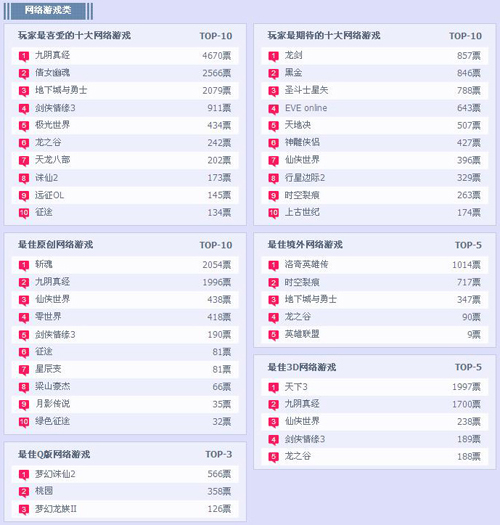 本周榜单中玩家最喜爱的十大网络游戏榜中变化不大,依旧被“九阴真经”独占鳌头,“倩女幽魂”“地下城与勇士”居于其次,后排的游戏想要跻身前三看来要付出更大的努力。最佳原创网络游戏榜中“斩魂”以微弱的差距超越“九阴真经”荣登榜首。玩家最期待榜单中“龙剑”“黑金”几乎齐头并进,而“洛奇英雄传”和“天下3”则分别领先最佳境外网络游戏榜与最佳3D网络游戏榜。网页游戏类中“卧龙吟”居于玩家最喜爱榜单首位,但“大侠传”“神曲”等游戏实力也同样不容小觑随时有赶超的可能。玩家最期待榜单中“萌三国”以颇大的差距拉开次位的“大将军”,不知道后期还能否保持此时的优势。手机游戏类榜单则相对较平稳,由“捕鱼达人”“DNF:地下城与勇士”平分最佳单机榜与最佳网络榜榜首,而暂时位列其次的众款游戏很有可能会后来居上。