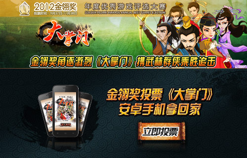战鼓雷动、军旗飘扬,“游戏奥斯卡”金翎奖2012年度游戏评选投票阶段正在进行。作为最具中国风的武侠类手游大作,《大掌门》的排名目前已经跃居前五,而且与前几名的差距非常微弱!众位江湖豪杰、武林侠士,赶紧拿出你的手机,为你心爱的《大掌门》投出决定胜负的一票吧!投票就有机会拿到安卓智能手机一部,同时还有安卓平板、海量充值卡等你来拿,赶快行动吧!