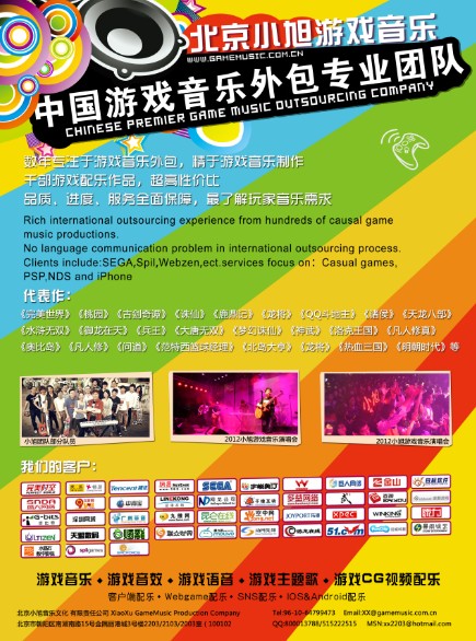 小旭音乐,是国内最大的游戏音乐制作团队,公司地处北京望京,在游戏音乐和游戏音效方面已有近十年的制作经验,在行业中小有名气。大量的游戏音频制作经验使得小旭在游戏音频外包方面处于行业鳌头地位。除了与著名游戏声音引擎FMOD的开发公司澳大利亚Firelight有着良好的合作关系外,点对点提供强大的技术支持,让小旭在游戏音乐测评方面拥有先进方案。