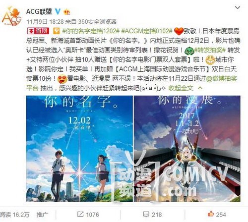微博 转发赠送【你的名字电影门票双人套票】活动火热进行中,
