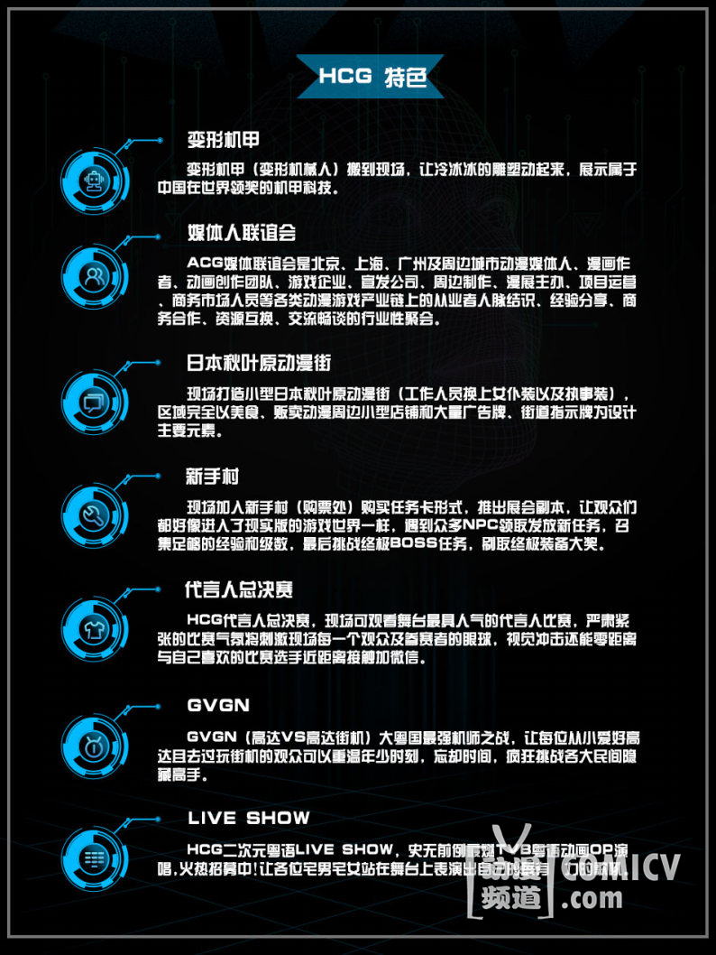 本届HCG展览会除了动漫游戏板块,新增科技板块,力图打造一个新型跨越B2B和B2C界限的展示平台,除了品牌展示与观众参观的基本功能之外,重点打造现场热卖的展会环境。展览会将会把动漫、游戏、科技三大板块的元素汇集在参展商的可变形机器人项目,届时大型可变形机器人可与国内外企业界、科技界、爱好者观众现场互动,VR、AR等领域的领先科技也将展示它们在动漫游戏界的应用前景。